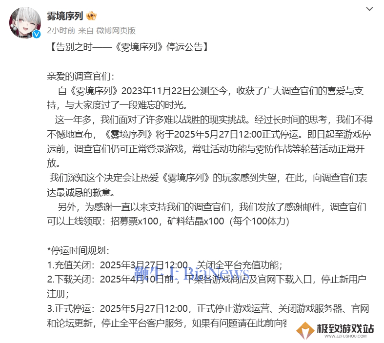 《雾境序列》手游宣布将于2025年停运,今日起关闭充值功能